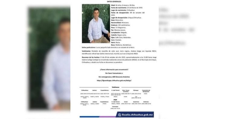 La Fiscalía General del Estado de Chihuahua emitió una ficha de búsqueda relacionada a la desaparición del encuestador del Instituto Nacional de Estadística y Geografía (Inegi), Jorge Gabriel Zúñiga Carbajal de 66 años de edad, quien fue visto por última…